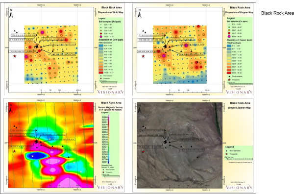 Figure 1. Black Rock Gold, Copper Soil Anomalies (top right and left), Magnetic Susceptibility Survey (bottom left) and Satellite Imagery (bottom right)