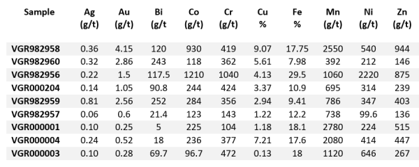 To date, a total of 52 rock samples and 218 grid soil samples have been analyzed, with select rock samples in the target area listed in Table 1. Sample results ranged from below the detection limit to the high values shown in the table below.