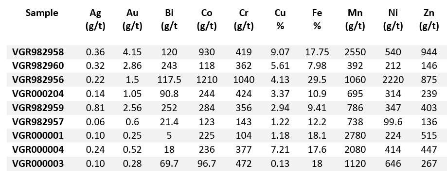 To date, a total of 52 rock samples and 218 grid soil samples have been analyzed, with select rock samples in the target area listed in Table 1. Sample results ranged from below the detection limit to the high values shown in the table below.