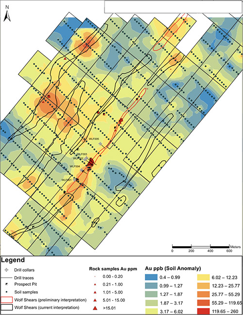Confirmation rock channel samples across the Wolf Shear were taken at different sample locations along the same structure and returned results almost identical to previously reported channel samples with an average of 10.2 m of 5.19 g/t gold (See NR dated February 3rd, 2021), as compared with the new samples, which returned an average of 5.12 g/t gold over 11.5m. Rock chip samples in other areas of the Wolf Gold Project seem to correlate well with surface gold in soil anomalies and structural features mapped at surface. See attached map (Figure 1) and table (Table 1) below.