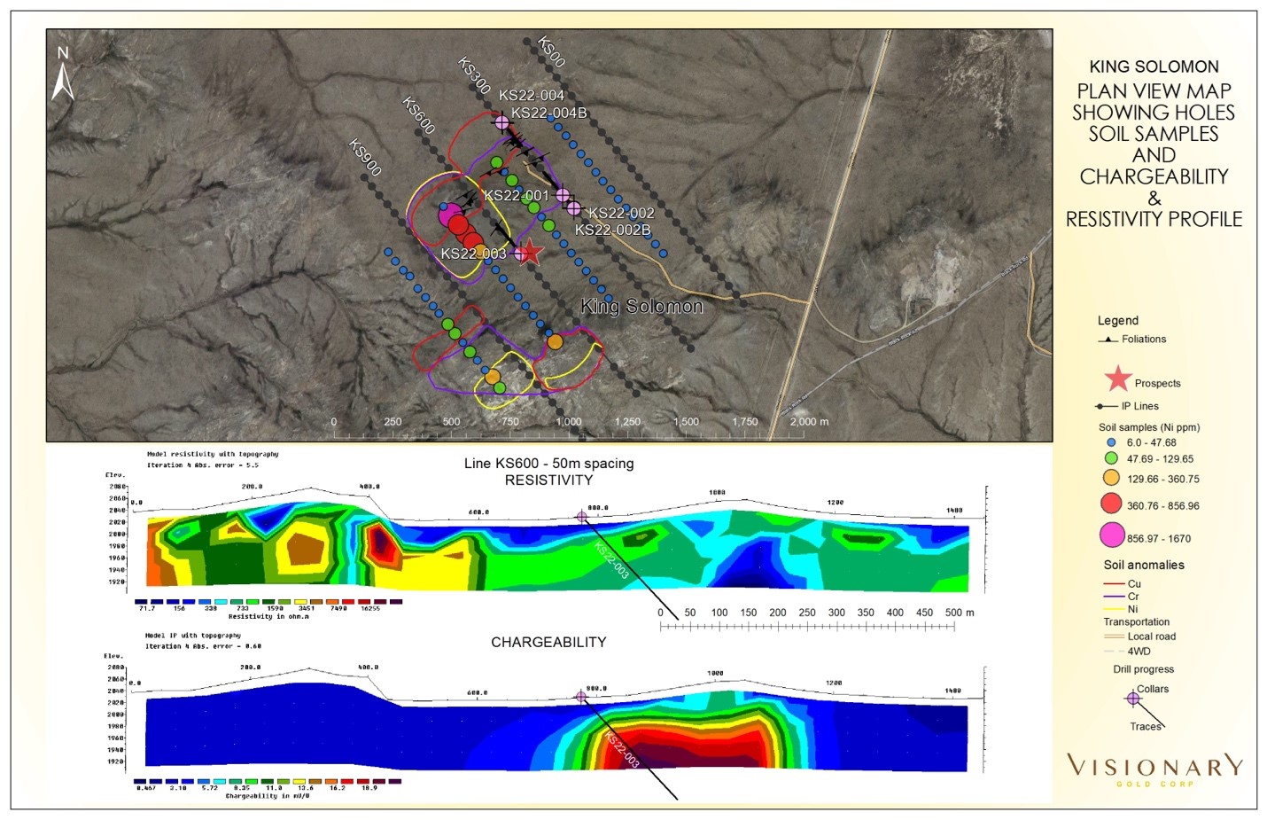 The King Solomon drill target was identified after Visionary discovered surface copper, nickel gold and cobalt mineralization 3 km east of KS22-003 at Black Rock (see May 5th 2022 press release). Subsequently, an induced polarization ("IP") geophysical survey highlighted a zone of possible sulfide mineralisation below surface copper and zinc soil anomalies (see September 7th, 2022, press release.) The first two holes drilled at King Solomon were KS22-001 and KS22-002. Both holes encountered disseminated to semi-massive sulfide within iron-rich Archean sediments that had anomalous, but insignificant grades of copper and zinc. A third hole, KS2-003 was planned 300 m south of KS22-001 targeting another possible sulfide zone beneath a correspondent nickel-chromium soil anomaly. In this hole, disseminated sulfides were observed at around 100 m depth within intermediate and mafic intrusive rocks beneath the barren sediments. The more dominantly mafic intervals correlated with anomalous nickel, chromium, cobalt, and gold-platinum-palladium values over 68 m, with higher values over 17 m in the middle of the mineralised zone. Holes KS22-004B and BR22-001 intersected zones believed to be from nickel oxides, as no sulfides were observed. It is possible that these intercepts are insignificant, however, were included to highlight the high mineral tenor and potential of the mafic rocks regionally, as those holes were drilled 300 m north and 3 km east of KS22-003, respectively. Thin section and X-ray diffraction analyses of select samples from these holes will be analyzed to better understand the lithology, sulfide chemistry and geologic order of all mineralised intercepts.