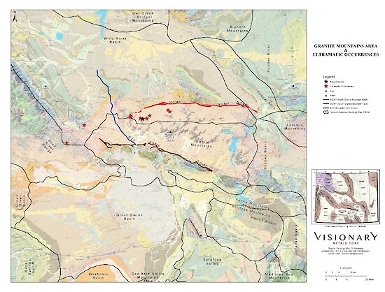 The Granite Mountains district is dominated by Archean granite, granite-gneiss and banded iron formation, within which younger Archean peridotite to pyroxenite bodies occur over a length of 100 km, defining an underexplored Archean Greenstone Belt (Figure 1). Visionary’s land package covers many of these outcropping ultramafic bodies and has recently expanded to approximately 13,686 acres, or 55km2 including 520 unpatented 20-acre mining claims on Bureau of Land Management lands and 3286 acres of Wyoming State lease lands. During the 2023 field season, many nickeliferous ultramafic occurrences were inspected, all of which were unexplored prior to Visionary’s exploration efforts. Visionary’s inhouse geophysical crews conducted ground magnetic, dipole-dipole, and gradient array induced polarization ("IP") surveys. We have now identified many magnetic anomalies west of King Solomon that correspond with interpreted ultramafics at Tin Cup to the west of King Solomon. A drill-ready target exists 900 m west of King Solomon, at the Dumbbell prospect, on an outcropping peridotite with a coincident gradient array IP anomaly. Tin Cup contains numerous drill-ready ultramafic-IP targets. Disseminated nickel sulfides have been identified microscopically in an olivine pyroxenite 20 km east of King Solomon. All of this highlights the excellent potential for nickel sulfide discoveries regionally and within Visionary’s strong land position and proximity to excellent infrastructure.