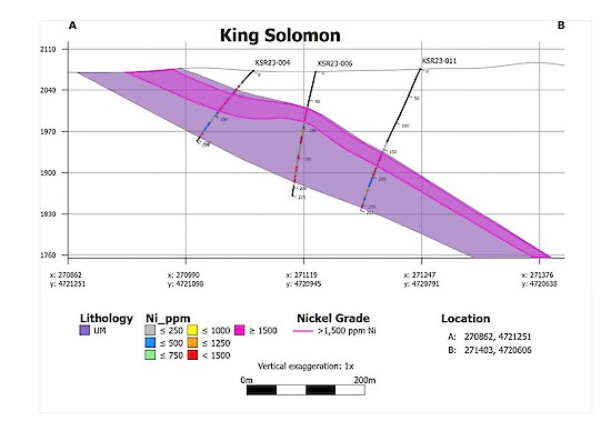 “We are encouraged to see widespread nickel mineralization in all but two RC drill holes in 2023 and look forward to an expanded diamond core drilling program at King Solomon in 2024,” commented CEO Wes Adams. “The 2023 RC drill program confirmed our hypothesis that King Solomon is a large, disseminated nickel sulfide deposit and core drilling in 2024 is expected to better define distribution of mineralization, and determine true widths and grades, as RC drilling is only an indicative exploration tool. The fact that we have consistently identified magmatic sulfides in thin section analysis is also encouraging and suggests that there may be additional high-grade nickel mineralization within the system, as demonstrated in hole KSR23-004.”